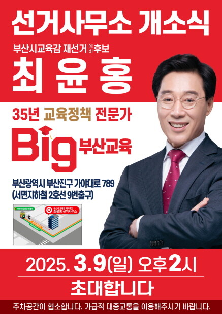 부산시교육감 재선거에 출마한 최윤홍 예비후보는 9일 오후 2시 선거사무소 개소식을 갖는다고 7일 밝혔다. 선거 사무소는 서면로터리 주변 부산진구 가야대로 789 1층에 마련됐다.