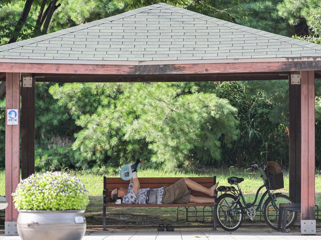 ▲ 공원에 나온 어르신이 벤치에 누워 부채로 더위를 쫓고 있다. [이상훈 선임기자]