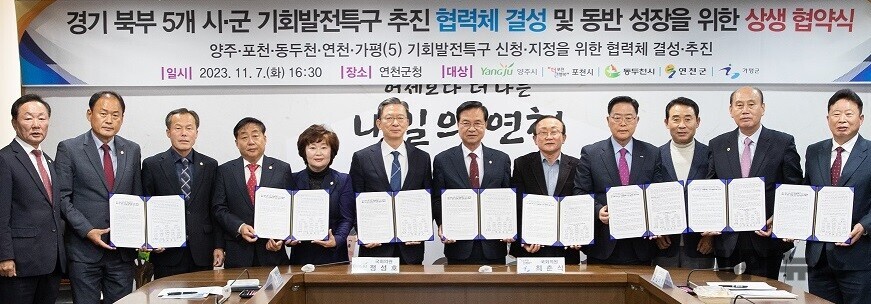 양주·포천·동두천·연천·가평이 정부의 기회발전특구 선정과정에 전략적으로 연대하기로 했다. 이를 위해 5개 지역 시장과 군수는 7일 연천군청에서 ‘경기북부 5개 시·군 기회발전특구추진협력체 결성 및 동반 성장을 위한 상생협약’을 체결했다.