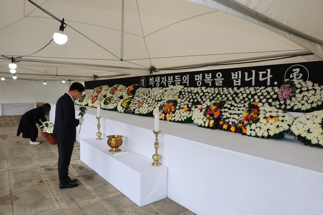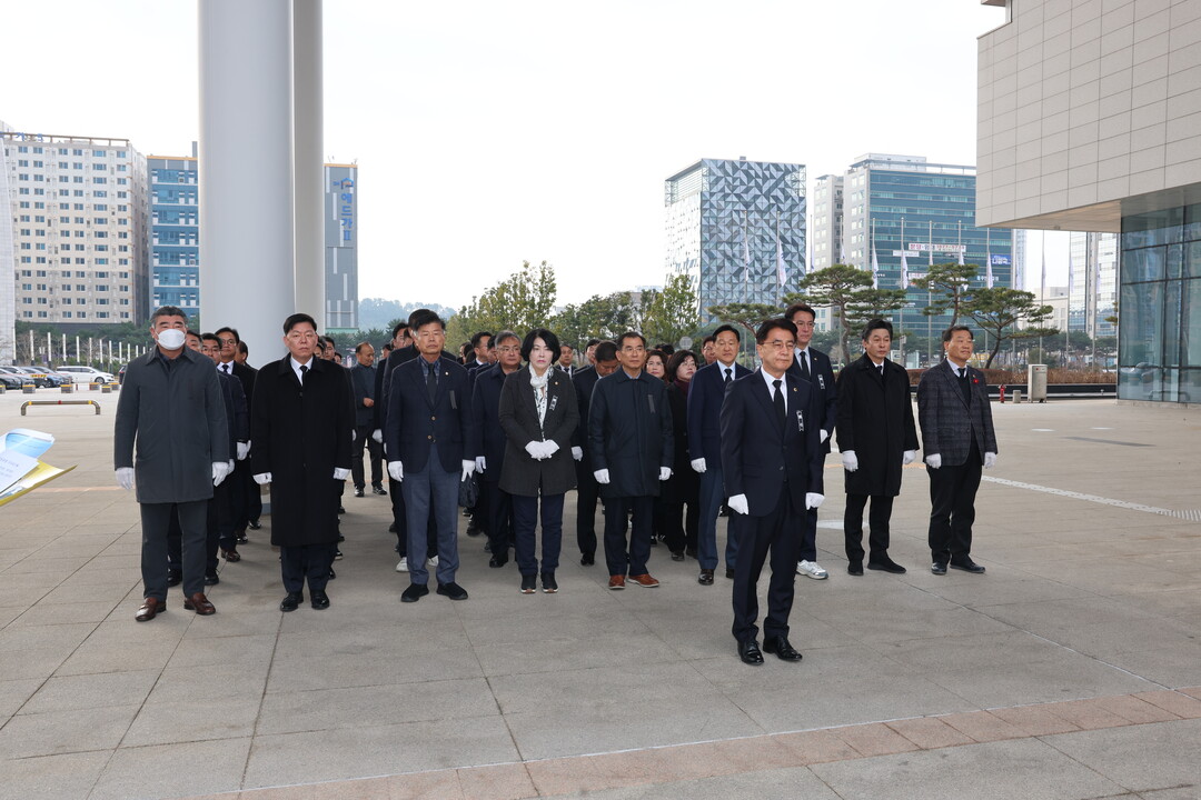 | ▲ 30일 김태균 전라남도의회 의장을 비롯한 도의원들이 도청 만남의 광장 합동분향소를 참배하고 있다. 도의회는 제주항공 여객기 참사와 관련해 사고대책지원단 4개반을 긴급 구성했다. [전남도의회 제공] |