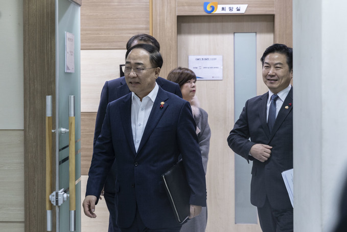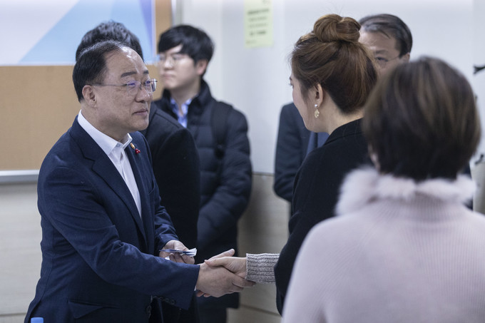 홍남기 경제부총리가 20일 오전 서울 종로구 소상공인진흥공단 서울전용교육장에서 열린 소통라운드테이블에 참석해 관계자들과 인사를 나누고 있다.