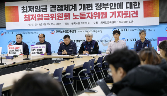 한국노동조합총연맹(한국노총)과 전국민주노동조합총연맹(민주노총) 등이 추천한 최저임금위원회 노동자위원들은 9일 서울 여의도 한국노총 대회의실에서 기자회견을 열고 이렇게 밝혔다.