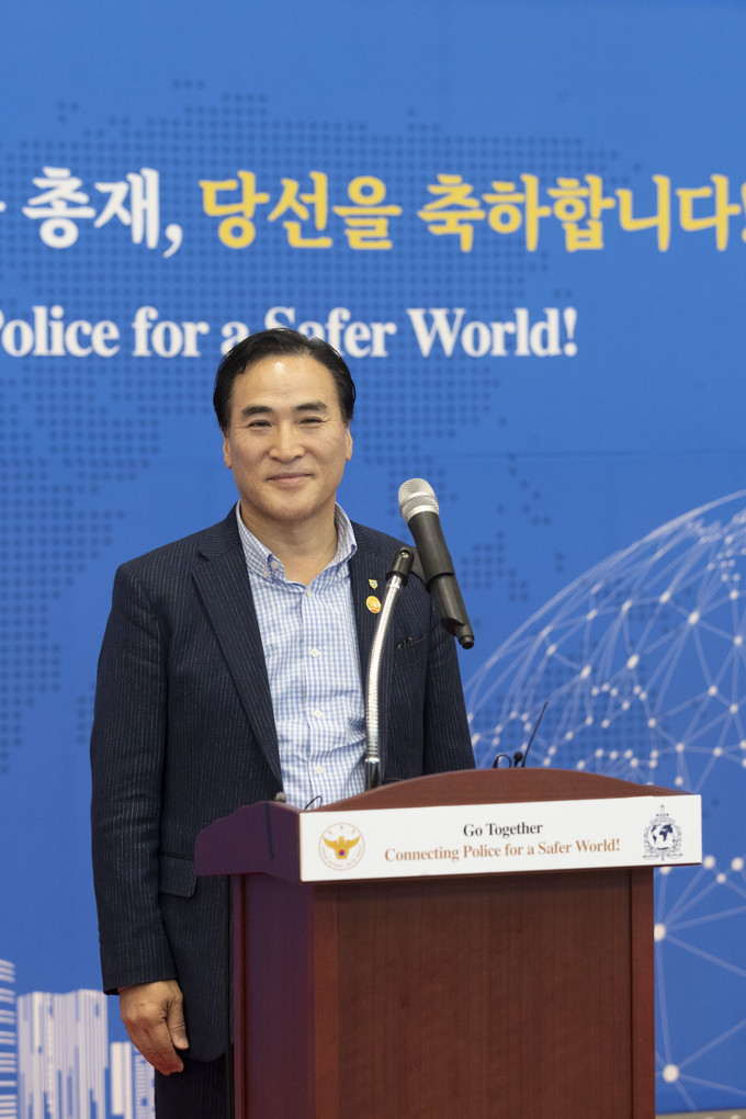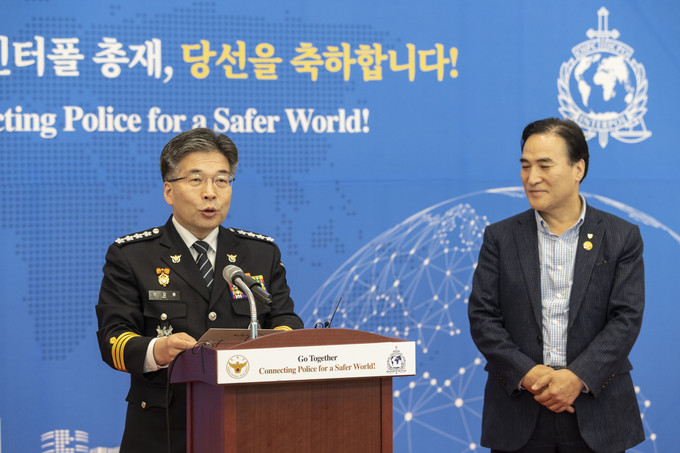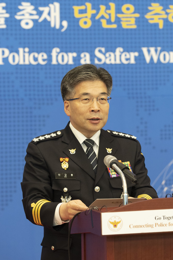 민갑룡 경찰청장이 23일 오전 인천국제공항 제2여객터미널을 통해 귀국한 김종양 인터폴 신임총재의 기자회견에서 문재인 대통령 축전을 대독하고 있다.