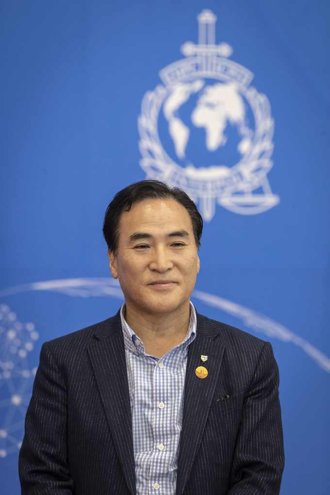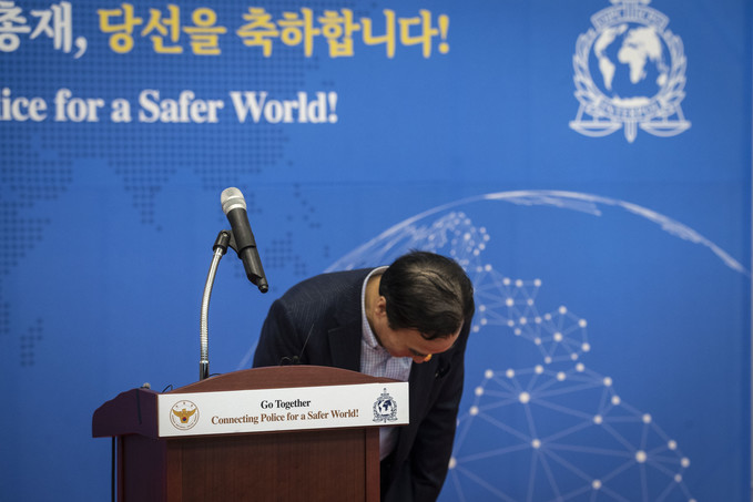 김종양 인터폴 신임총재가 23일 오전 인천국제공항 제2여객터미널을 통해 귀국, 기자회견장에서 인사하고 있다.