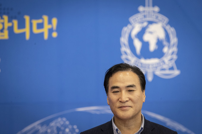 김종양 인터폴 신임총재가 23일 오전 인천국제공항 제2여객터미널을 통해 귀국, 기자회견에 참석하고 있다.