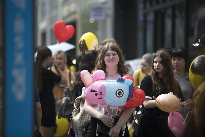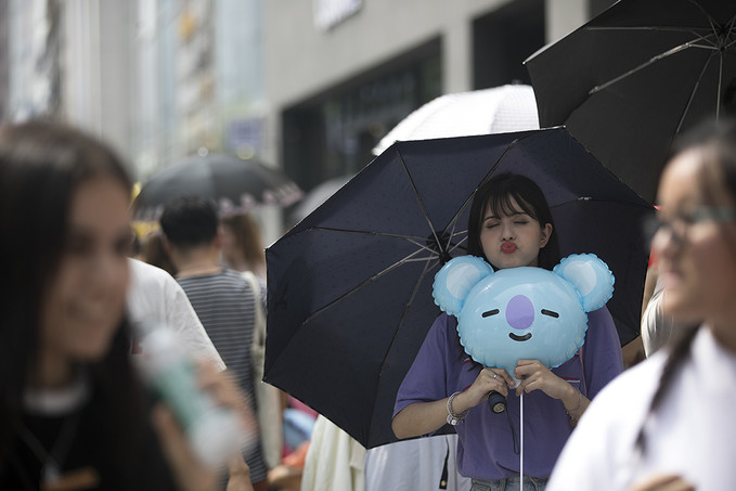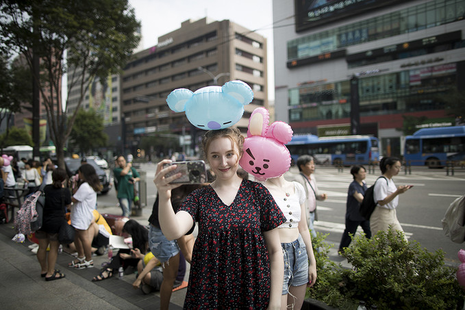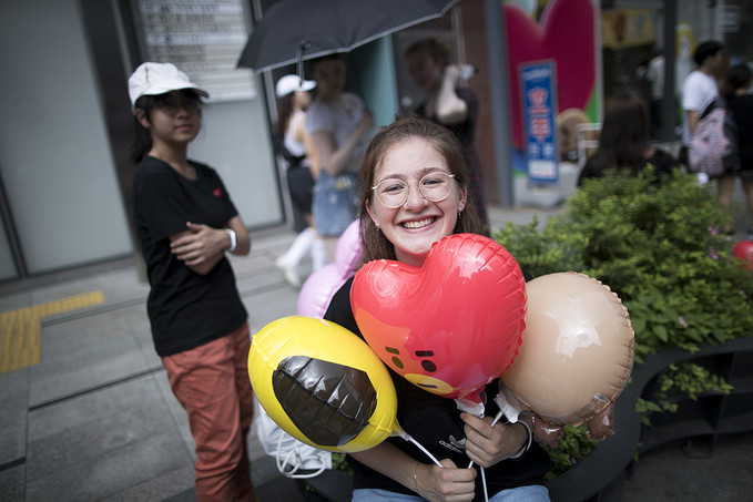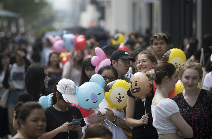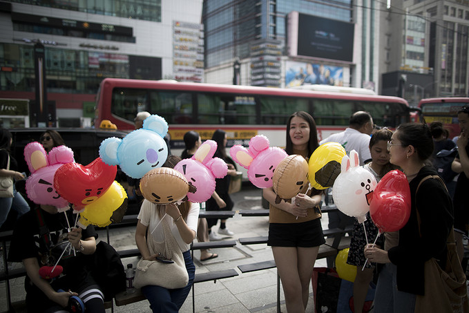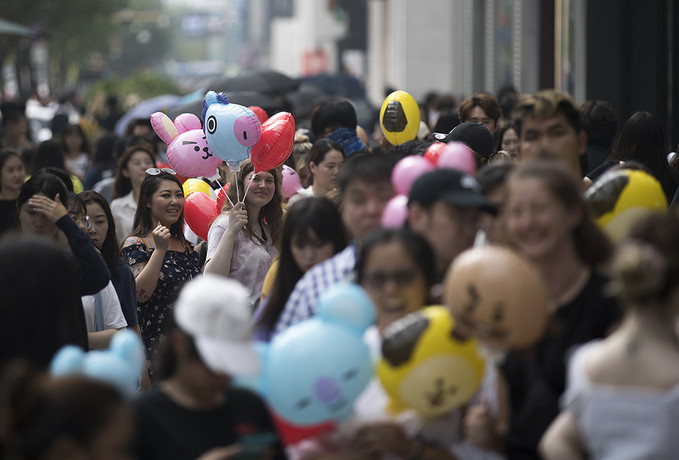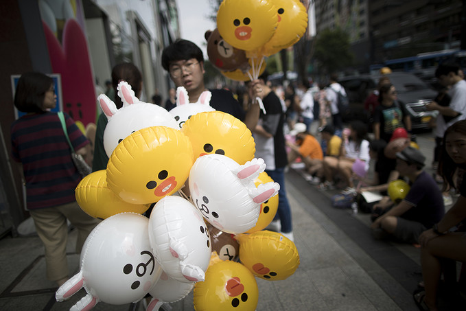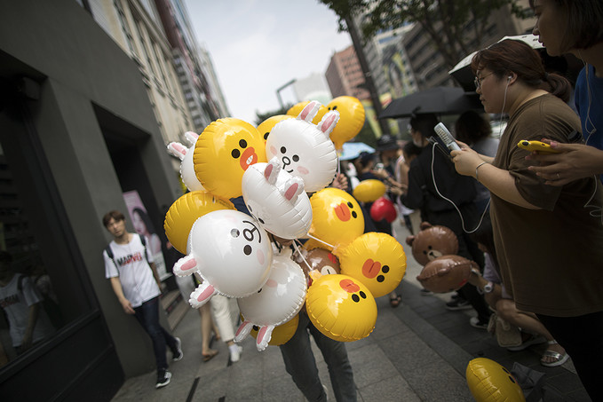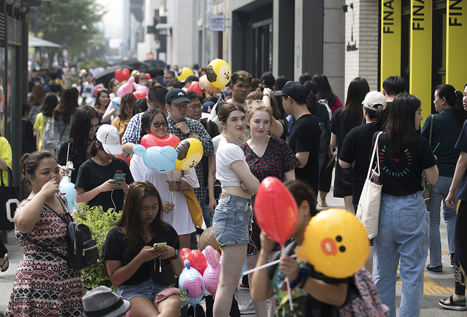 8일 서울 강남구에 오픈한 '라인프렌즈 플래그십 스토어 강남점'에서 라인프렌즈 캐릭터 풍선을 든 외국인 관광객과 시민들이 매장으로 들어가기 위해 줄지어 서있다.