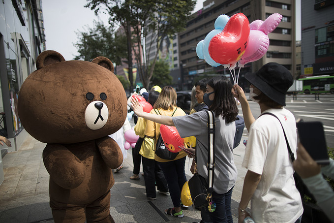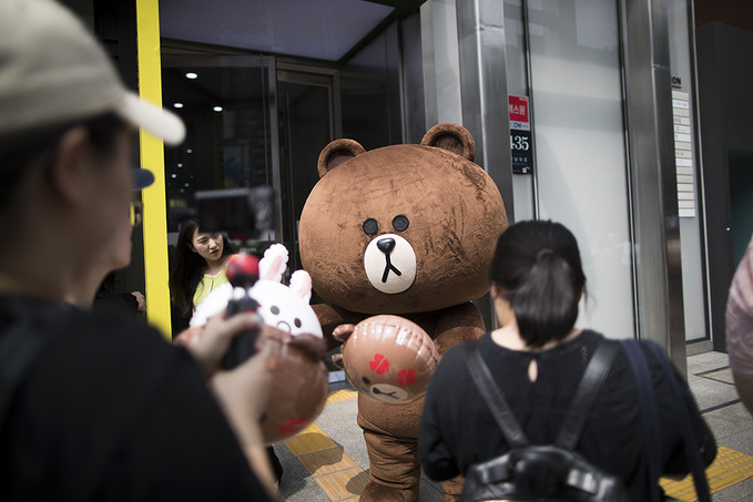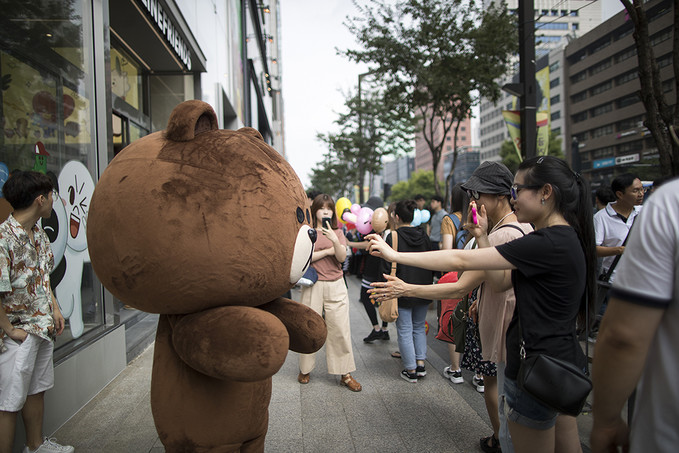 8일 서울 강남구에 오픈한 '라인프렌즈 플래그십 스토어 강남점'에서 외국인 관광객과 시민들이 라인프렌즈 캐릭터 브라운과 만나고 있다.