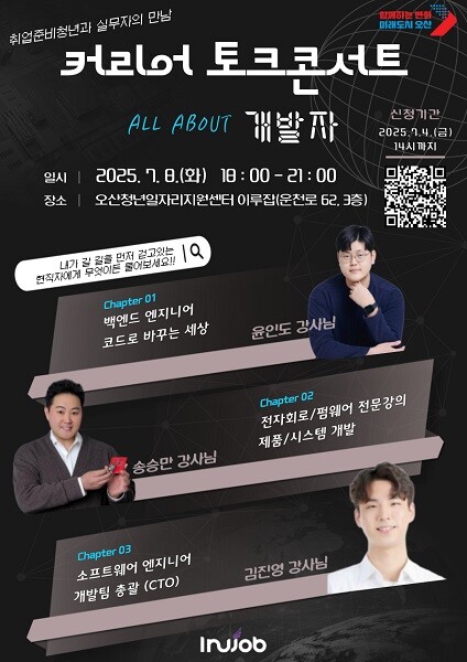 토크콘서트는 다음 달 8일 오후 6시부터 오산시 운천로 '이루잡'에서 개최되며, 백엔드 엔지니어, 제품·시스템 개발자, 소프트웨어 엔지니어 등 IT 분야 현직자 3인이 패널로 참석해 실무 중심의 생생한 취업 정보를 전달하게 된다.