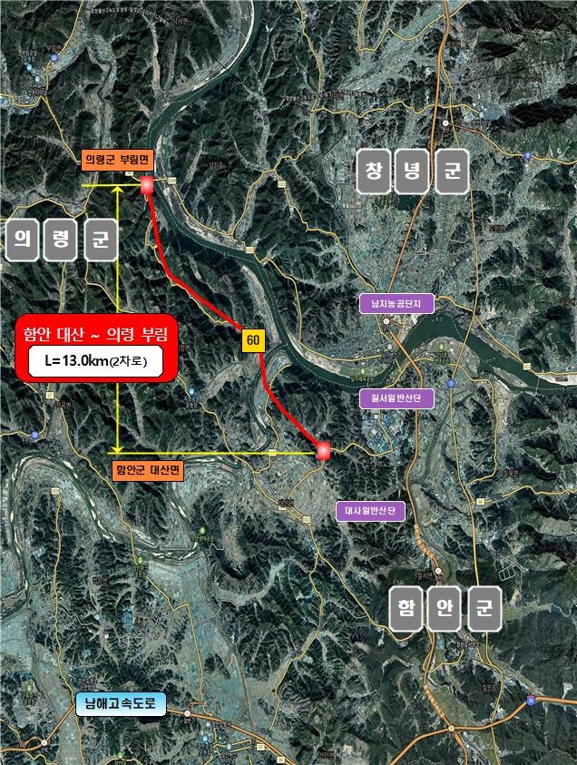이번 대상으로 선정된 구간은 함안 대산에서 의령 부림을 연결하는 국가지원지방도 60호선이다. 총연장 13㎞ 2차선을 신설 및 확장하는 사업으로, 총사업비는 1125억 원으로 예상된다.