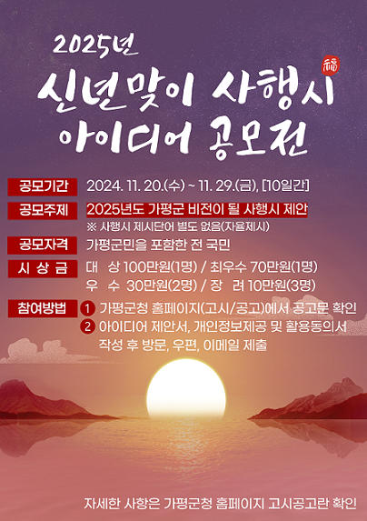 가평군은 2025년 새해 비전을 제시할 창의적 아이디어를 발굴하기 위해 사행시를 공모한다. 특정 제시어는 없고 오는 29일까지 누구나 참여할 수 있다.