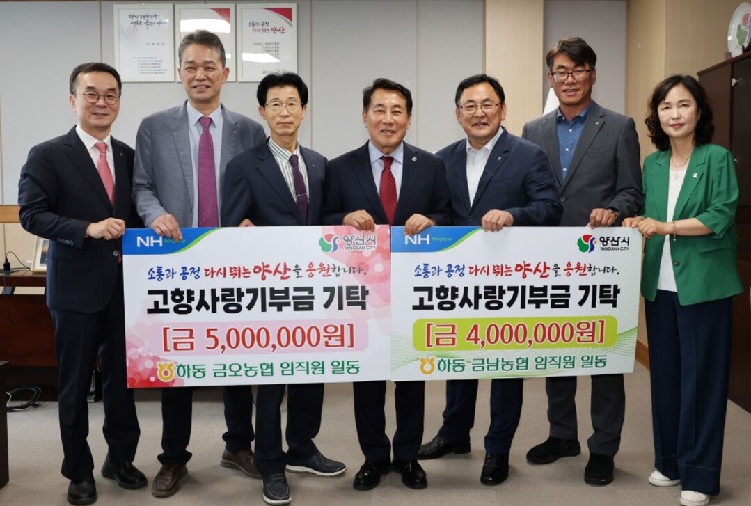 경남 하동 금오농협(조합장 정영대)과 금남농협(조합장 김홍수)은 14일 고향사랑기부금 900만 원을 양산시에 기탁했다. 하동지역 농협 임원들의 이날 양산 방문은 양산농협(조합장 오영섭)과의 상호 기부 차원에서 이뤄졌다.