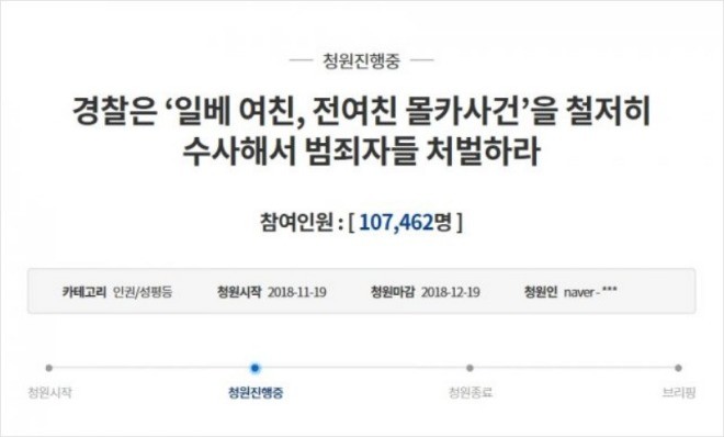 19일 청와대 홈페이지 국민청원 및 제안 게시판에는 '경찰은 일베 여친, 전 여자 친구 몰카 사건을 철저히 수사해서 범죄자들 처벌하라'는 제목의 청원 글이 올라왔다.