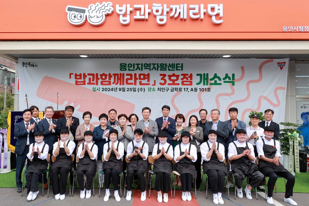 | ▲ 지난 25일 개점한 '밥과함께라면' 3호점에서 용인시와 3호점 관계자들이 기념활영을 하고 있다. [용인시 제공] |