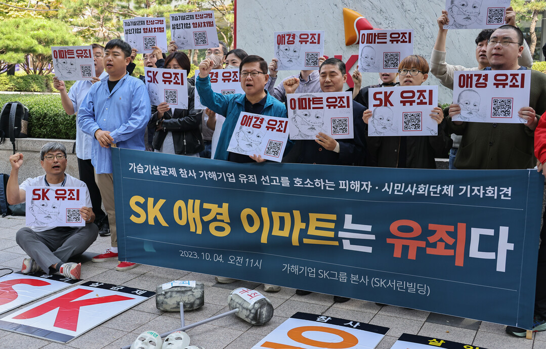 | ▲ 가습기살균제를 제조·판매한 SK케미칼, 애경산업, 신세계이마트 등 가해기업 전직 임직원 13인에 대한 사건의 항소심 결심공판을 앞두고 4일 오전 서울시 종로구 SK서린빌딩 앞에서 유죄를 촉구하는 기자회견이 열렸다.[이상훈 선임기자] |