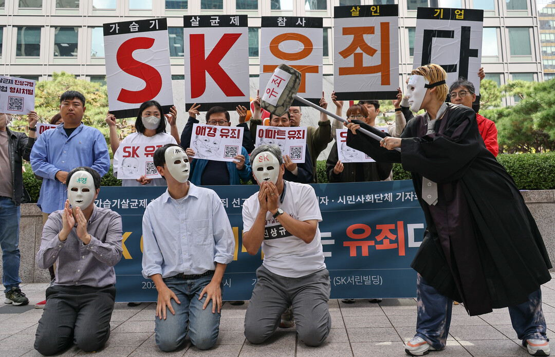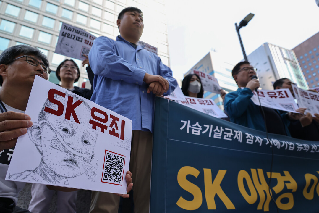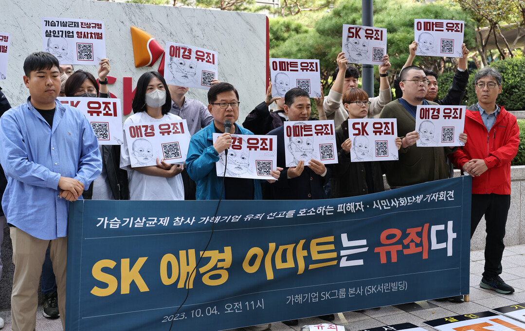 건강권 실현을 위한 보건의료단체연합이 오는 10월 16일 CMIT/MIT를 원료 물질로 만든 가습기살균제를 제조·판매한 SK케미칼, 애경산업, 신세계이마트 등 가해기업 전직 임직원 13인에 대한 사건의 항소심 결심공판을 앞두고 4일 오전 서울시 종로구 SK서린빌딩 앞에서 기자회견을 열었다.