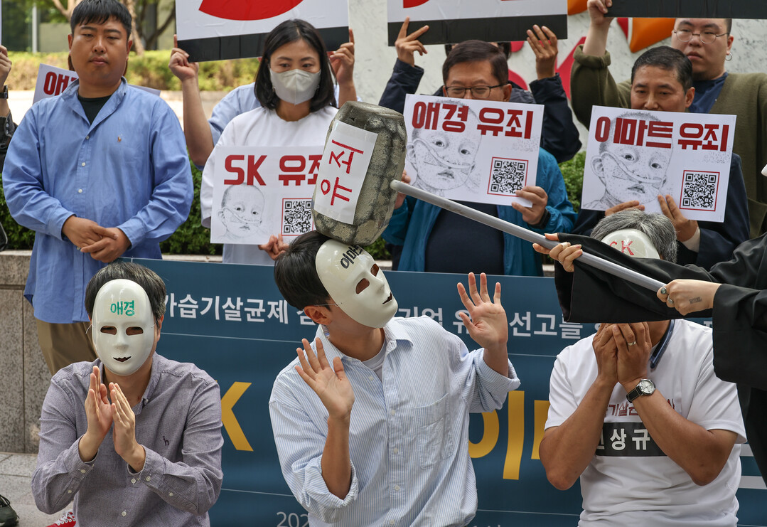 | ▲ 가습기살균제를 제조·판매한 SK케미칼, 애경산업, 신세계이마트 등 가해기업 전직 임직원 13인에 대한 사건의 항소심 결심공판을 앞두고 4일 오전 서울시 종로구 SK서린빌딩 앞에서 열린 유죄를 촉구하는 기자회견에서 참가자들이 법봉으로 가해기업에게 유죄를 선고하는 퍼포먼스를 하고 있다.[이상훈 선임기자] |