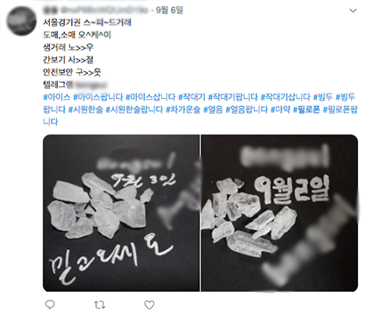 최근 올라온 한 트위터 글쓴이는 필로폰으로 추정되는 하얗고 불투명한 작은 돌이 담긴 비닐 봉지 사진을 게재하고, '#술팝니다' '#아이스' '#작대기팝니다' '#전국총알거래'같은 해시태그를 달아 놓았다. '작대기' '아이스' '얼음' '술'은 필로폰을 뜻하는 은어로 알려졌다.