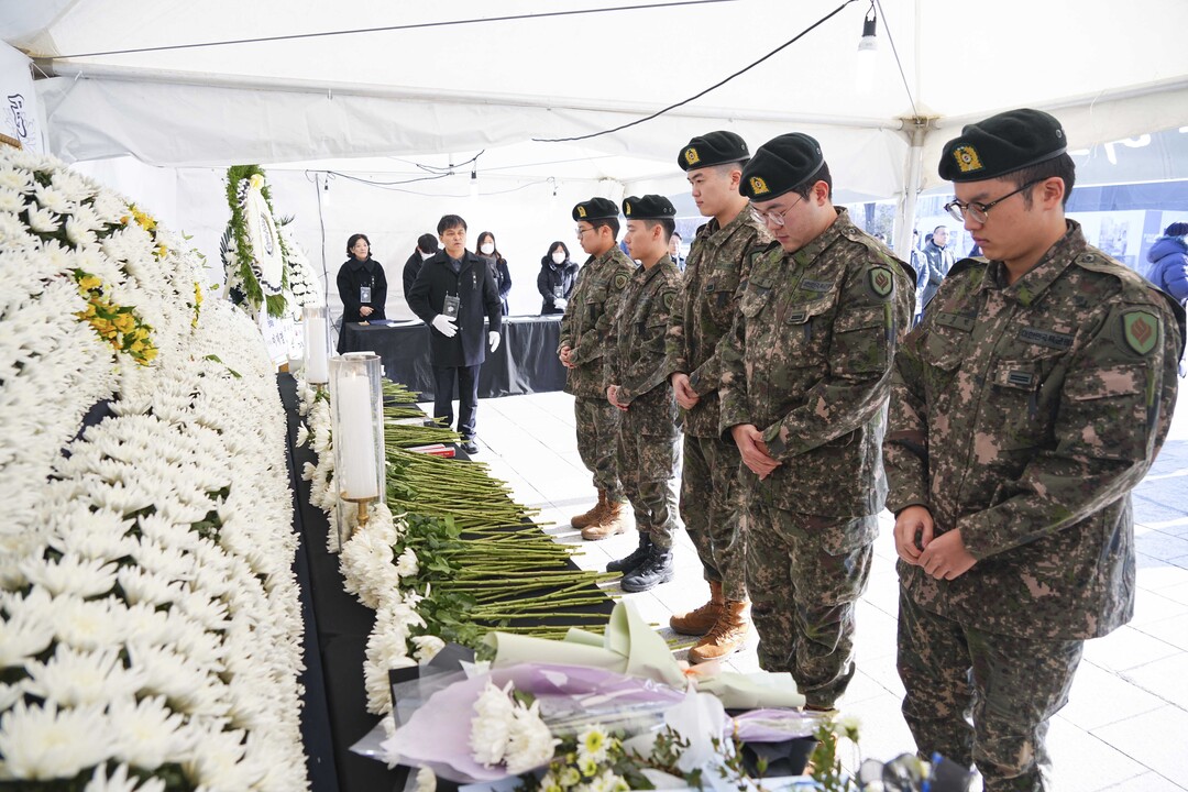 ▲ 지난 2일 광주광역시 동구 5·18민주광장에 마련된 제주항공 여객기 참사 합동분향소를 찾은 공군제1전투비행단 장병들이 조문을 하고 있다. [광주광역시 제공]