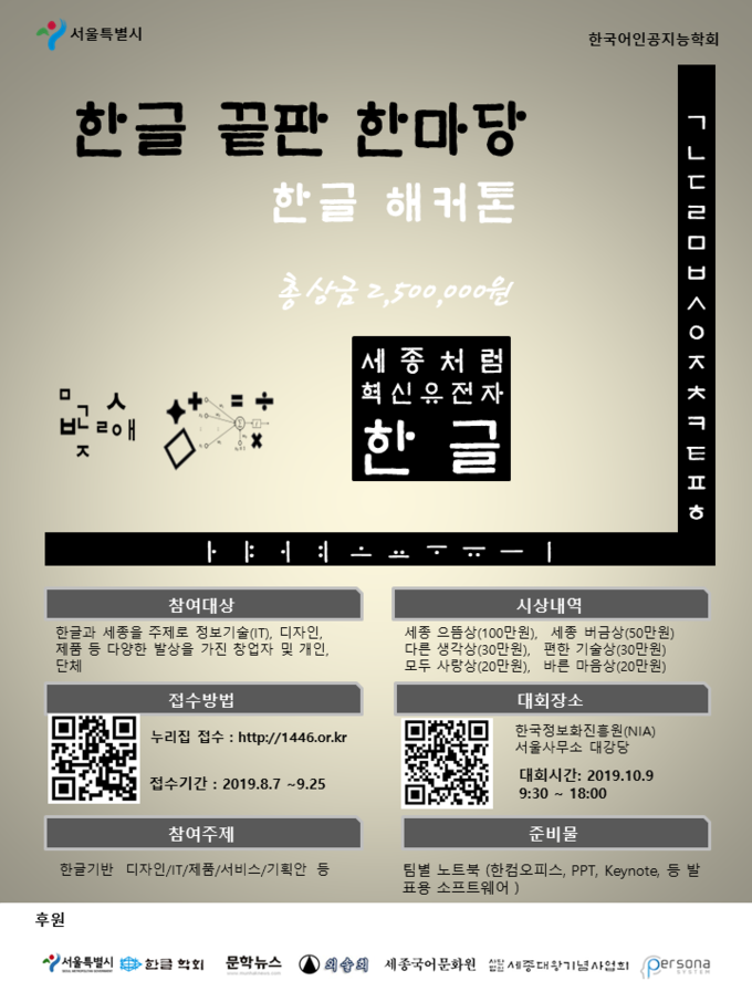오는 10월 9일 한글날, 세종 융합 아이디어 '한글 끝판 한마당(해커톤 대회)'가 광화문에서 열린다.