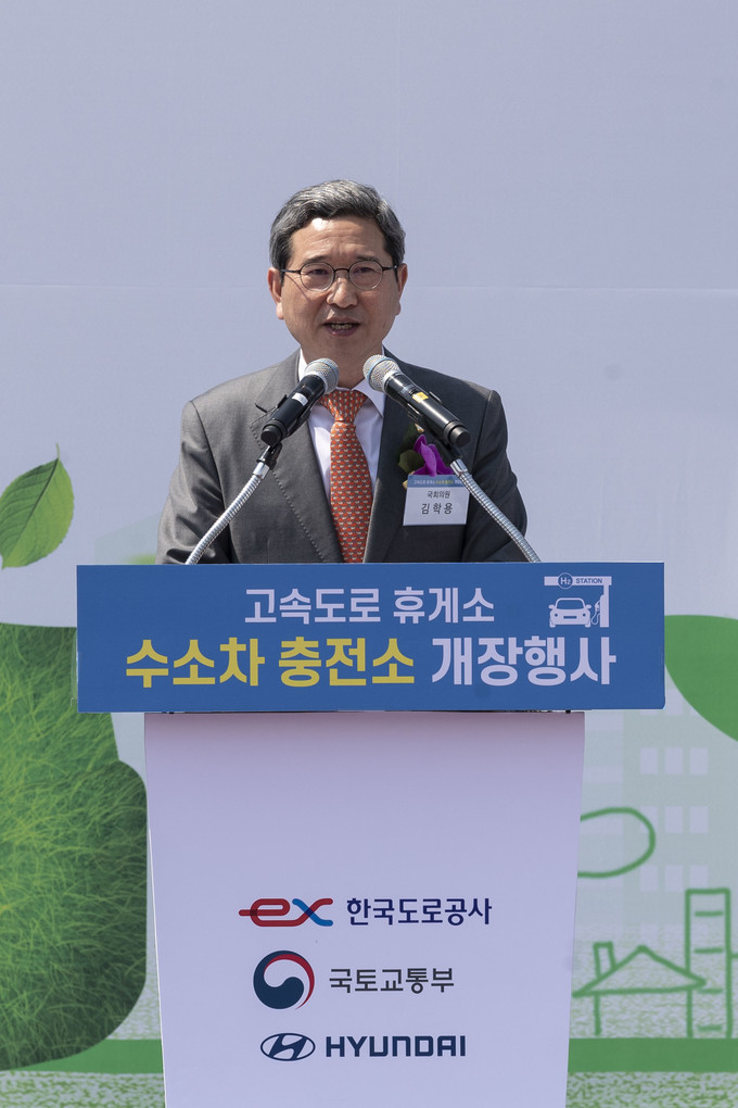 수소차 충전소 개장행사가 12일 오전 경부고속도로 부산방면 안성휴게소에서 열린 가운데 김학용 자유한국당 의원이 기념사를 하고 있다.