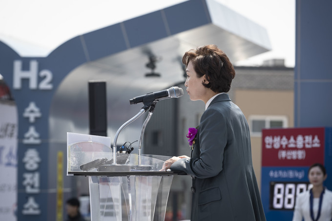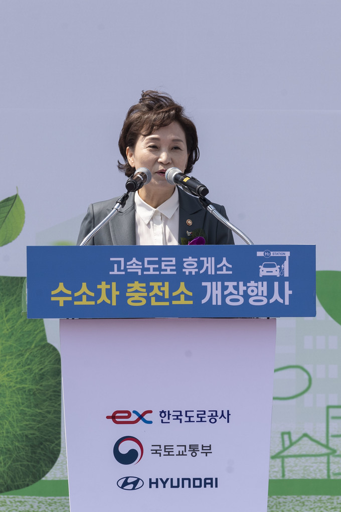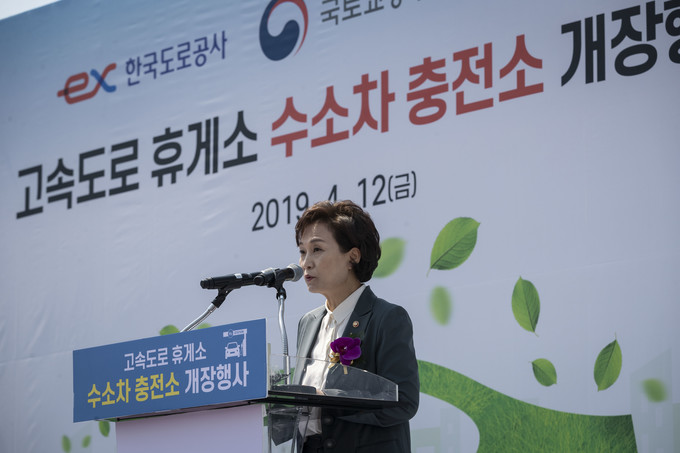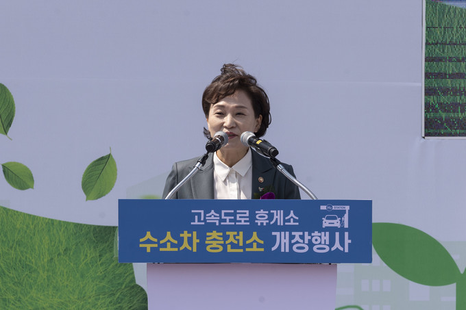 수소차 충전소 개장행사가 12일 오전 경부고속도로 부산방면 안성휴게소에서 열린 가운데 김현미 국토교통부 장관이 기념사를 하고 있다.