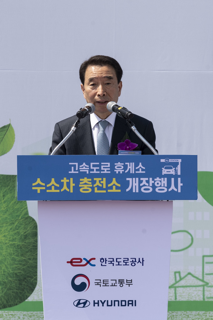 수소차 충전소 개장행사가 12일 오전 경부고속도로 부산방면 안성휴게소에서 열린 가운데 이강래 한국도로공사 사장이 기념사를 하고 있다.