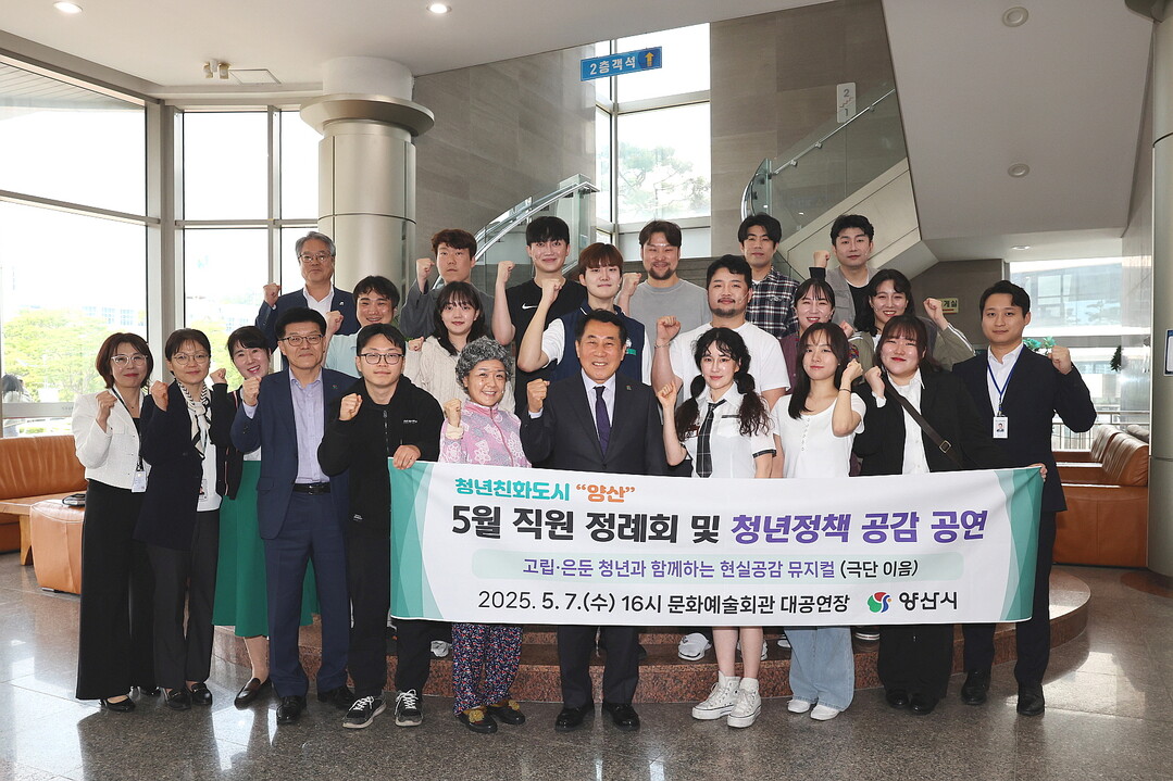 | ▲ 사진은 나동연 시장이 7일 직원들과 양산문화예술회관에서 고립·은둔 청년문제를 다룬 뮤지컬을 함께 관람한 뒤 기념촬영을 하고 있는 모습 [양산시 제공] |