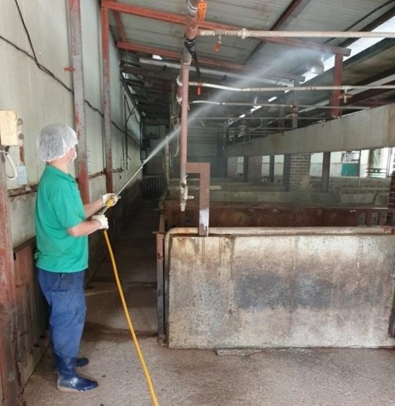 ▲ 북한에서 발생한 아프리카 돼지열병의 국내 유입을 막기 위해 정부가 총력전에 돌입했다. 사진은 지난달 31일 오후 강원도 내 한 양돈 농가에서 소독약품을 뿌리는 모습 [강원도 제공]