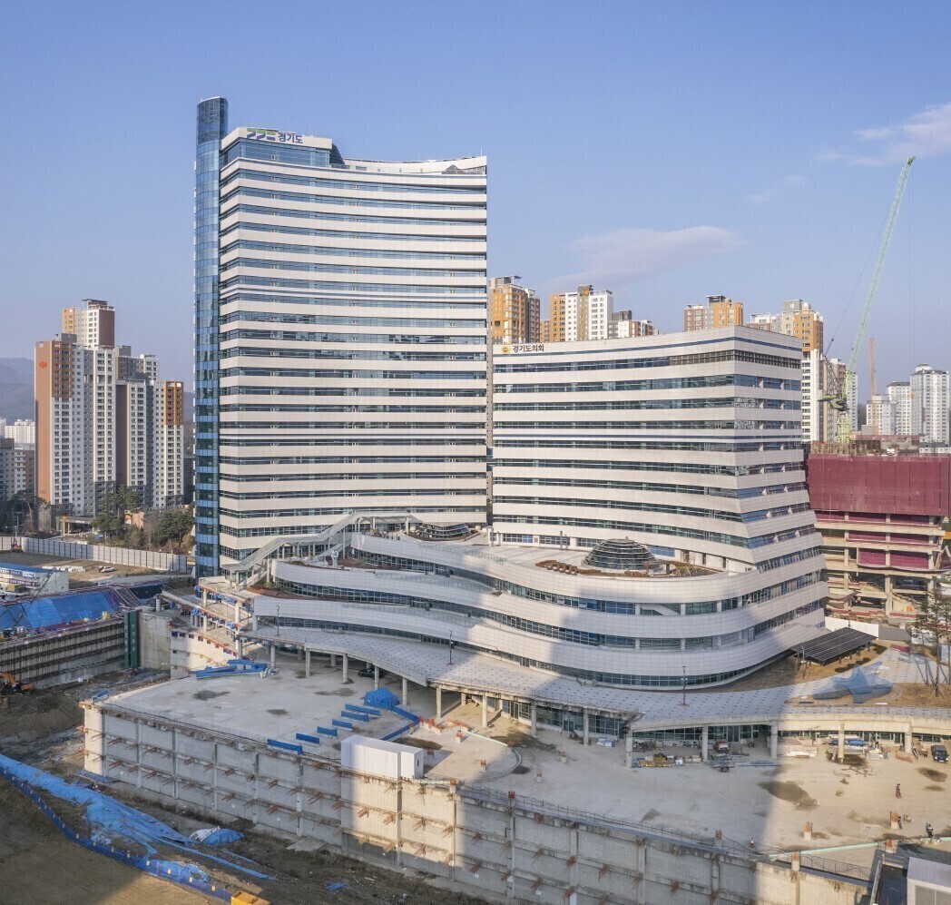 ▲ 경기융합타운 모습. 왼쪽 건물이 경기도청사, 오른쪽 건물이 경기도의회다. 둥그렇게 솟은 돔 아래 본회의장이 위치한다. [경기도의회 제공]