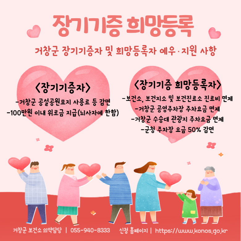 현재까지 거창군보건소에는 총 53명이 장기기증자로 등록했다. 장기기증 신청은 보건소 방문이나 보건복지부 국립장기조직혈액관리원 누리집을 통한 온라인으로 가능하다.
