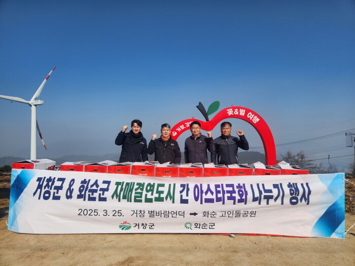 경남 거창군과 전남 화순군이 25일 거창 별바람언덕에서 지자체끼리 우의를 다지기 위해 아스타국화 나누기 행사를 개최했다.