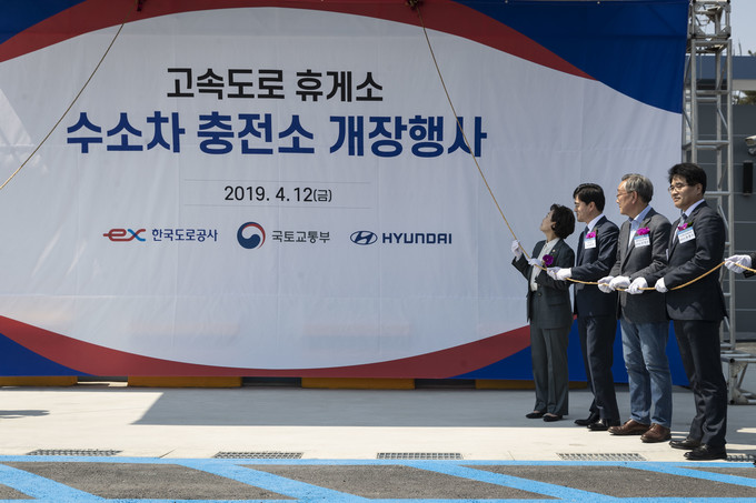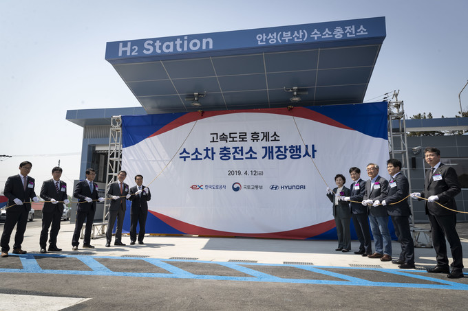 수소차 충전소 개장행사가 12일 오전 경부고속도로 부산방면 안성휴게소에서 열린 가운데 김현미 국토교통부 장관, 이강래 한국도로공사 사장, 김학용 자유한국당 의원, 공영운 현대자동차 사장 등 참석자들이 기념촬영을 하고 있다.