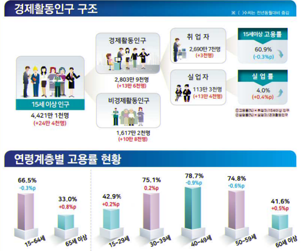 통계청이 12일 발표한 '2018년 8월 고용동향'에 따르면, 8월 현재 취업자 수는 2690만7천명으로 지난해 같은 달보다 3천명 느는 데 그쳤다. 반면 실업자는 지난해 8월 99만9천명보다 13만4천명 늘어난 113만3천명으로 집계됐다. 7월과 비교해도 9만4천명이 증가한 수치다. 실업률도 4.0%로 0.4%p 상승했다. 경제활동인구 100명 중 4명이 실업자인 셈이다. 특히 15~29세 청년층 실업자는 전년 동월 대비 2만5천명 증가했고, 실업률도 10%에 이르는 것으로 나타났다.