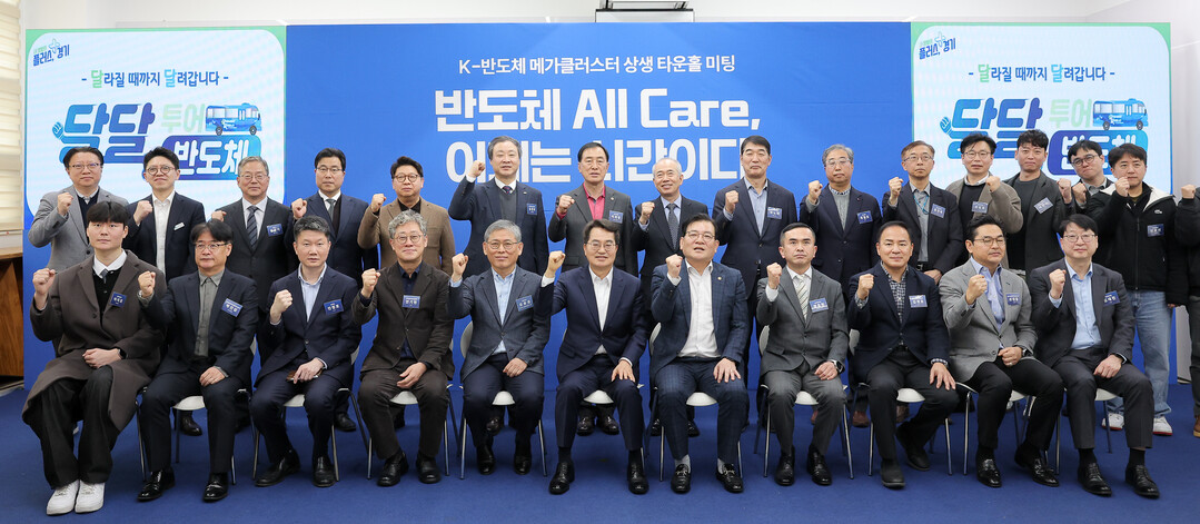 ▲ 27일 오전 단국대학교 용인 글로컬 산학협력관에서 'K-반도체 메가클러스터 상생 타운홀 미팅' 참석자들이 기념촬영을 하고 있다. [경기도 제공]