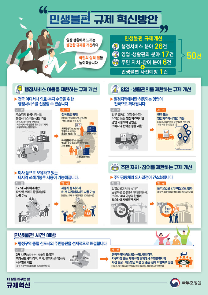 아울러 사업자의 영업권과 소비자의 선택권을 넓히기 위해 일부 유통업·어업·운수업·식약업 등 일정 지역에서만 허용해주던 영업을 전국 또는 인접 지역으로 확대해주기로 했다.
