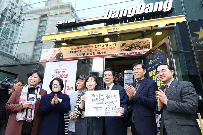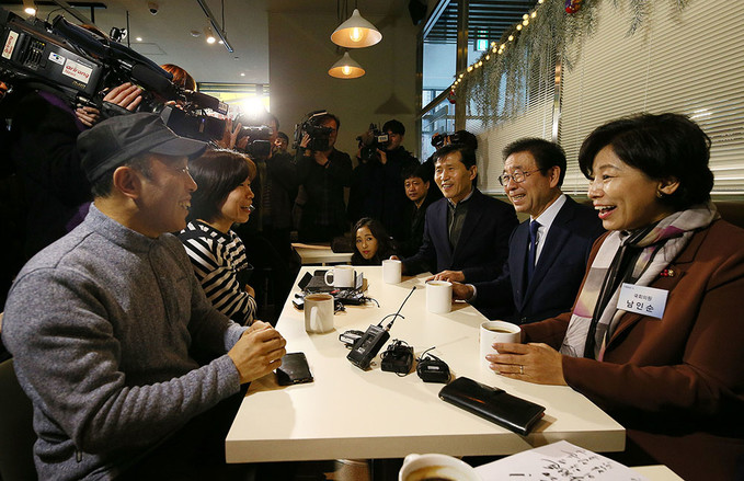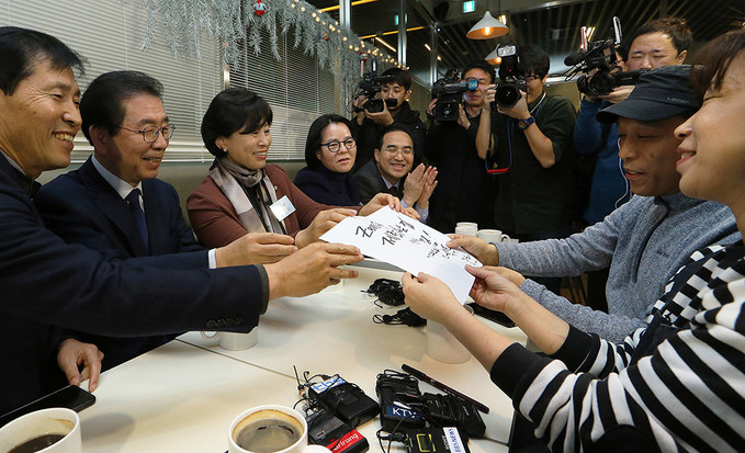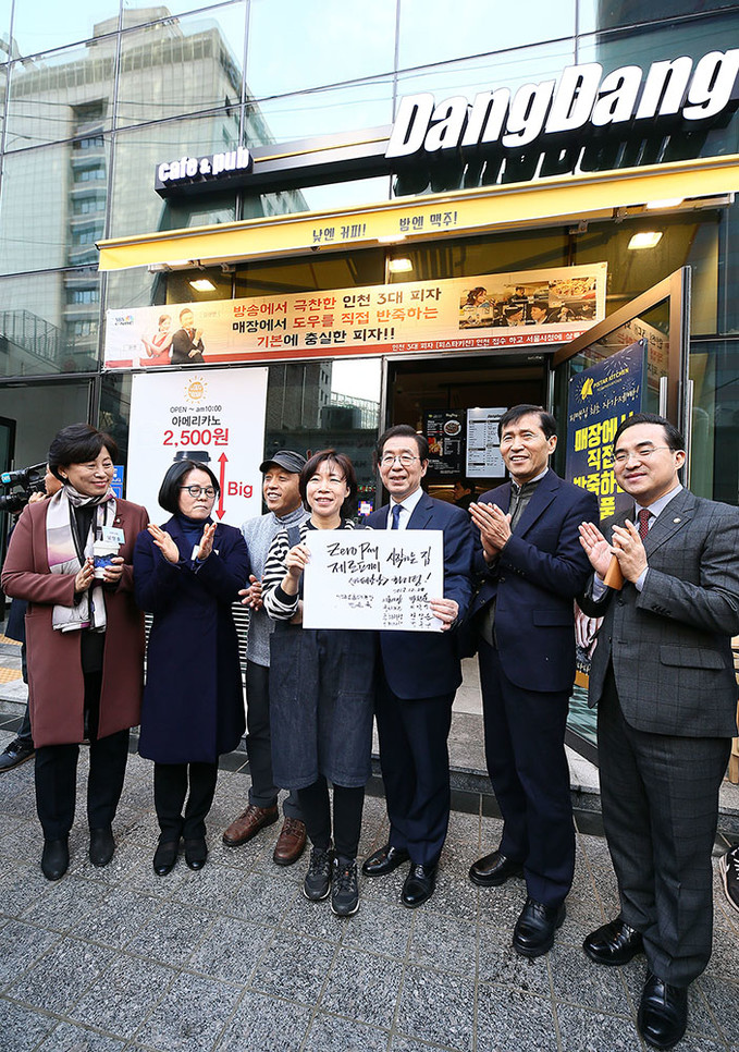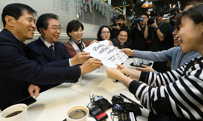 제로페이가 시행된 20일 오전 서울 중구 세종대로의 한 커피전문점에서 (왼쪽부터)이학영 더불어민주당 의원, 박원순 서울시장, 남인순 더불어민주당 민생연석회의 최고위원, 전순옥 더불어민주당 소상공인특별위원장, 박홍근 더불어민주당 의원이 제로페이 가맹점주 부부와 간담회를 갖고 응원문구가 적힌 메세지를 전달하고있다.