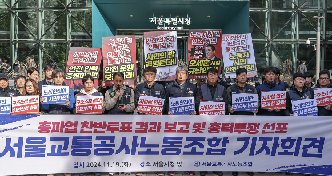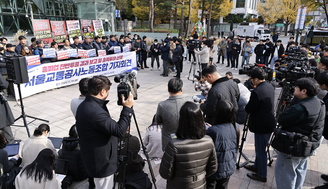 | ▲ 서울교통공사노동조합이 19일 오전 서울시청 앞에서 쟁의행위 찬반투표 결과 및 총력투쟁 방침 발표 기자회견을 열고 노조의 요구 묵살 시 12월 6일에 총파업에 돌입할 것이라고 밝혔다. [이상훈 선임기자] |