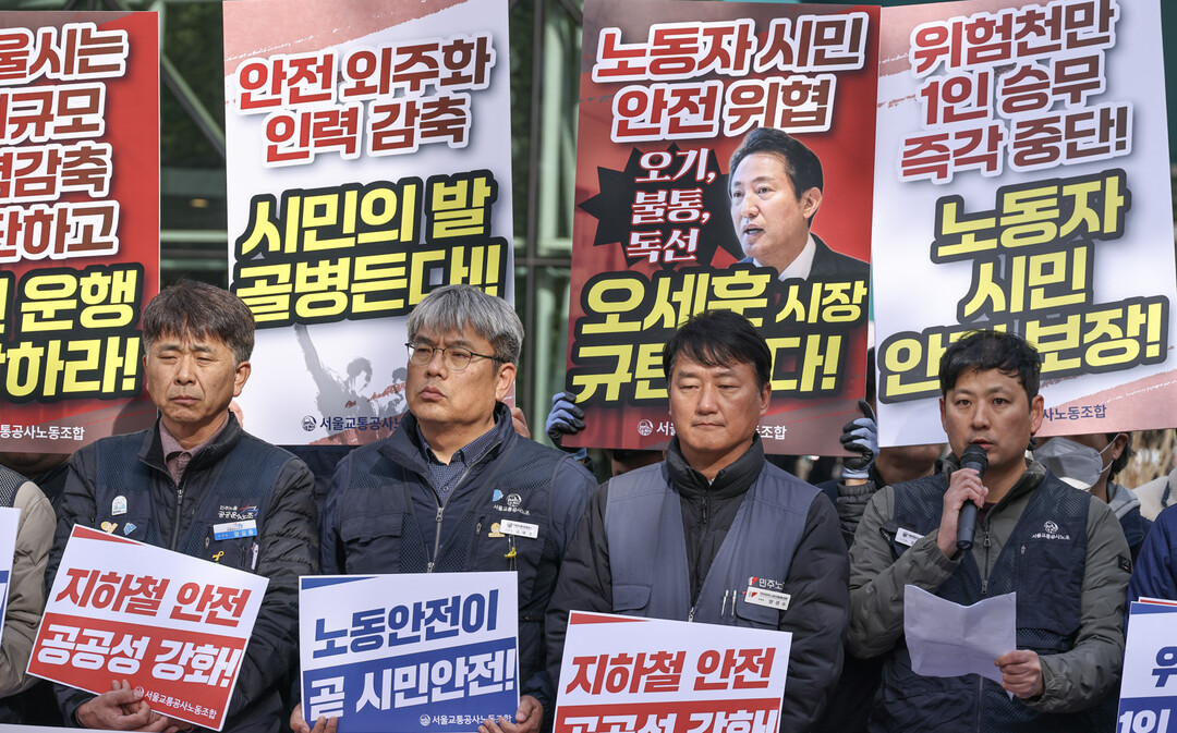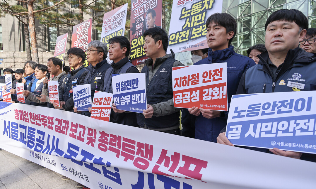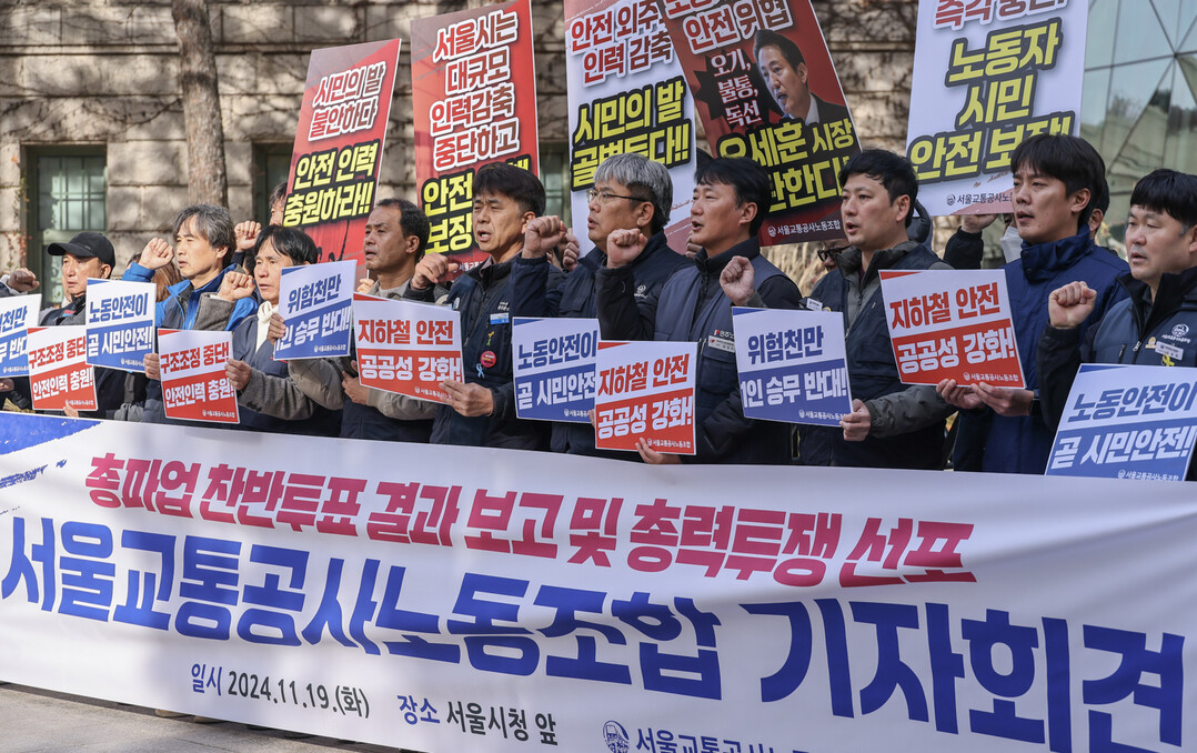 서울교통공사노동조합이 19일 오전 서울시청 앞에서 쟁의행위 찬반투표 결과 및 총력투쟁 방침 발표 기자회견을 열었다.