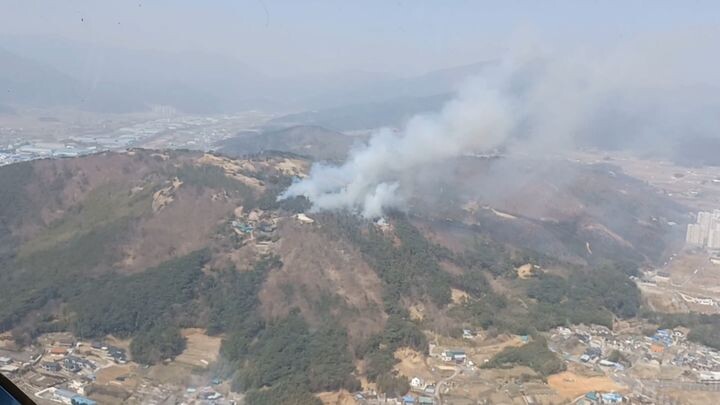 | ▲ 25일 오후 1시20분 촬영된 언양 화장산 산불 현장 모습 [울산소방본부 제공] |