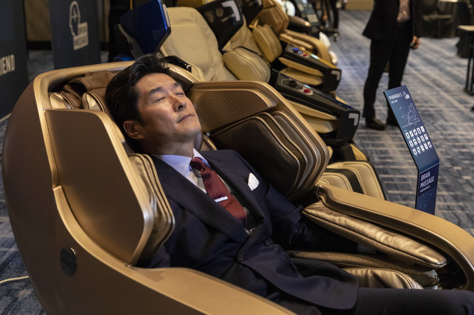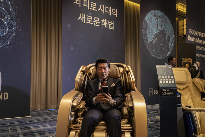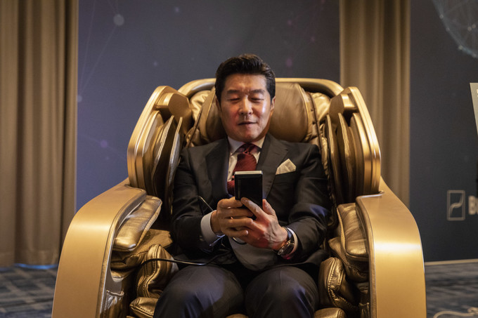 배우 김상중이 30일 오전 서울 종로구 포시즌호텔에서 열린 바디프랜드 '브레인 마사지- 뇌 피로 시대의 새로운 해법' 기자간담회에서 안마의자 체험을 하고 있다.