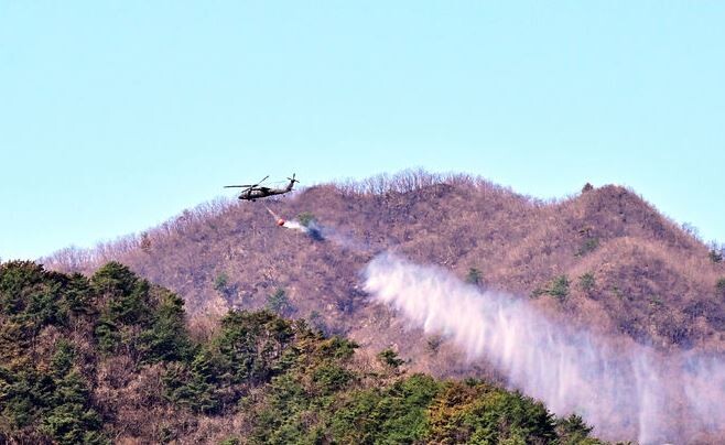 | ▲ 산청 산불 발생 10일째 30일 오전 군용헬기가 시천면 구곡산 일원에서 진화작업을 펼치고 있다. [뉴시스] |