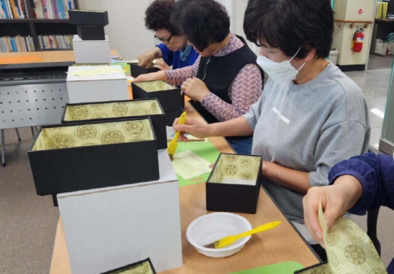 ▲ 사천시 장애인종합복지관 수강생들이 한지공예 수업을 하고 있다. [사천시 제공]