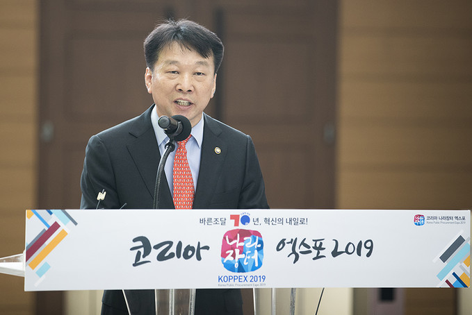 정무경 조달청장이 24일 오전 경기도 고양시 킨텍스에서 열린 '2019 코리아 나라장터 엑스포'에서 축사를 하고 있다.