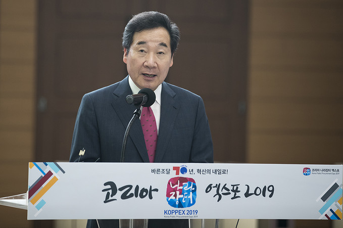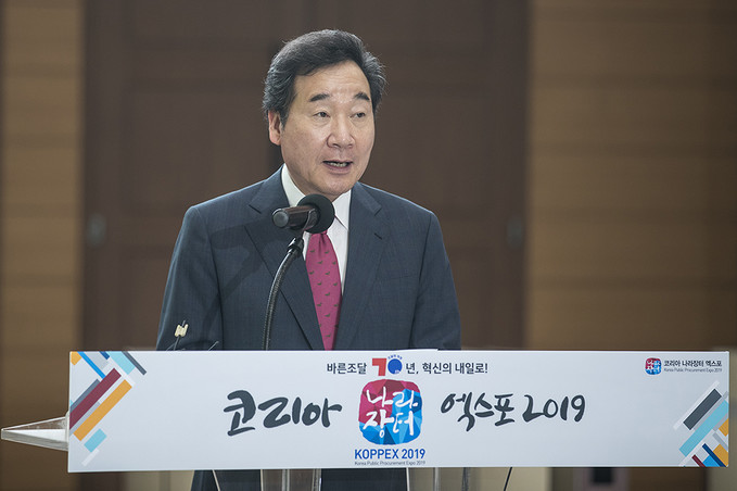 이낙연 국무총리가 24일 오전 경기도 고양시 킨텍스에서 열린 '2019 코리아 나라장터 엑스포'에서 축사를 하고 있다.