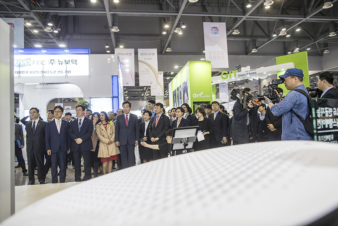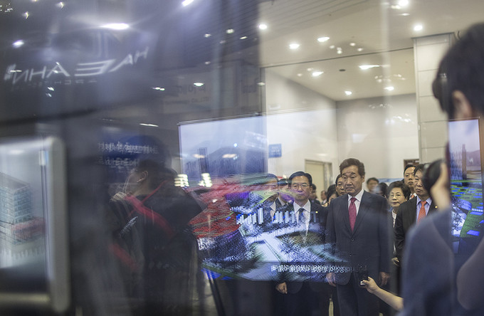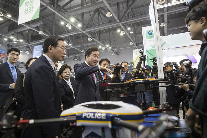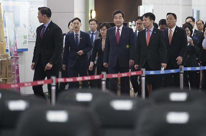 이낙연 국무총리가 24일 오전 경기도 고양시 킨텍스에서 열린 '2019 코리아 나라장터 엑스포'에서 전시장을 둘러보고 있다.