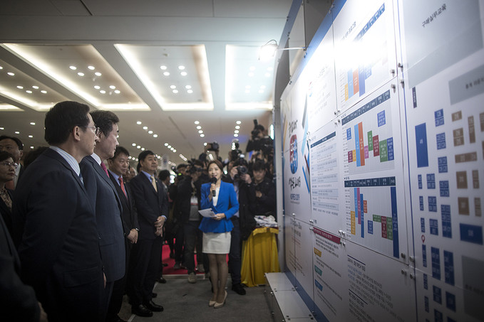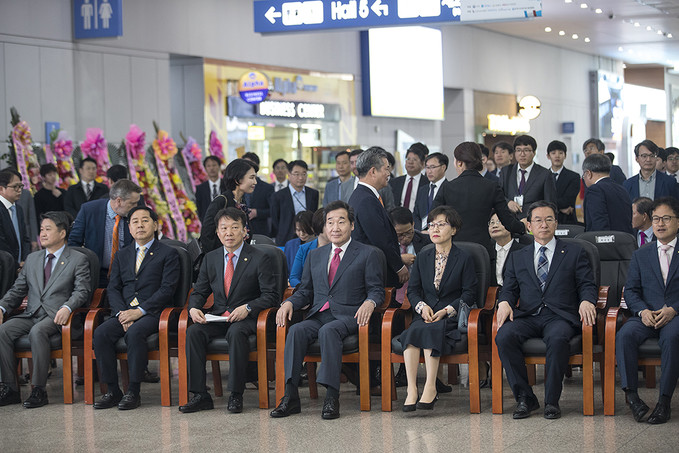 이낙연 국무총리, 정무경 조달청장 및 관계자들이 24일 오전 경기도 고양시 킨텍스에서 열린 '2019 코리아 나라장터 엑스포'에서 테이프 커팅식을 하고 있다.