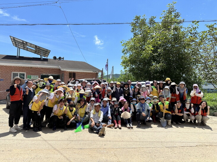 ▲ 경남도 가족센터협의회 회원들이 수해 복구 봉사활동에 참여한 뒤 단체촬영을 하고 있다. [산청군 제공]