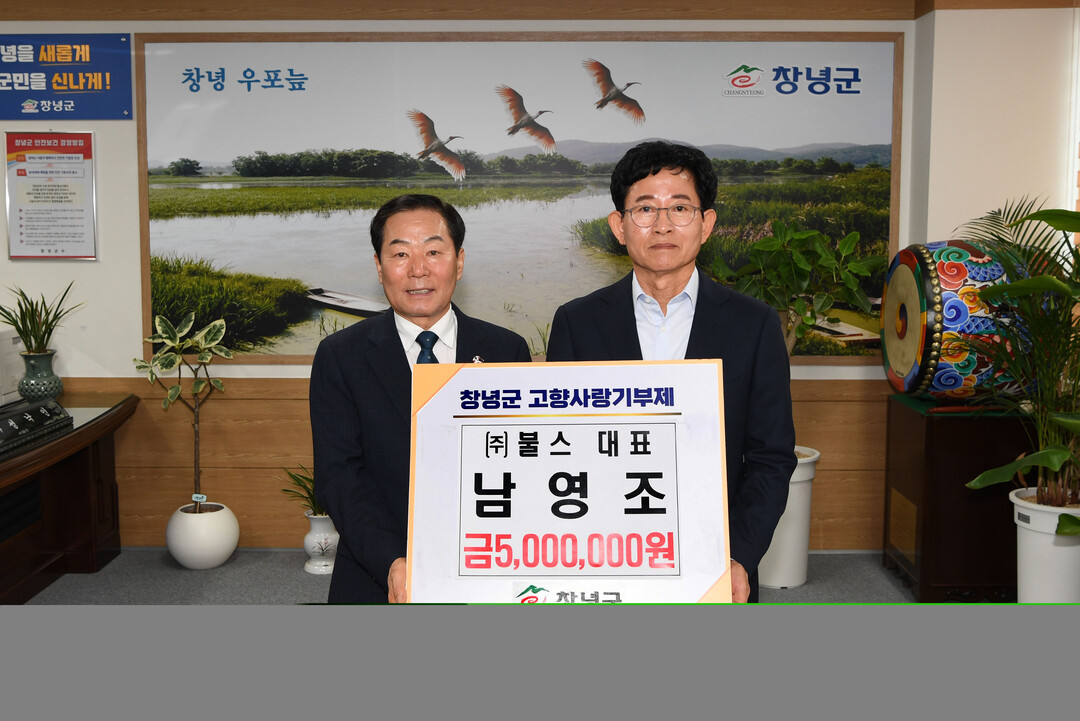 창녕군은 4일 ㈜불스 남영조 대표가 창녕군청을 방문해 고향사랑기부금 500만 원을 전달했다고 밝혔다.