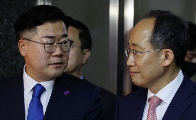 | ▲ 추경호(오른쪽) 국민의힘 원내대표와 박찬대 더불어민주당 원내대표가 지난달 27일 오전 서울 여의도 국회 의장실에서 김진표 국회의장 주재 회동을 마치고 나와 결과를 말하다 얼굴을 마주보고 있다. [뉴시스] |