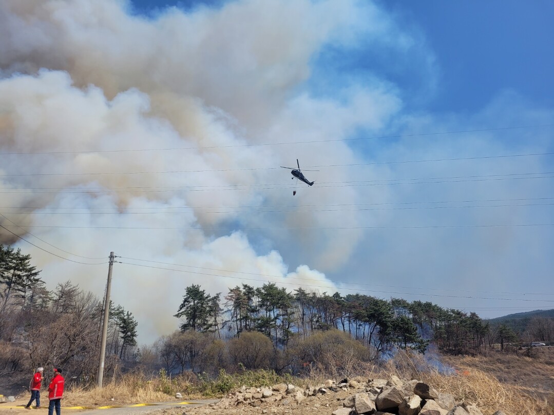 소방당국은 장비 9대, 인력 23명을 투입해 진화작업을 벌이고 있다. 경남 산청군 지리산 일원에서 대형산불이 발생한 가운데 이곳에도 산림청 소속 3대 등 진화헬기 5대가 투입됐다.